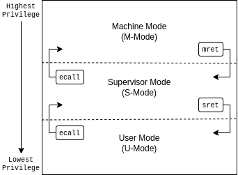 It's important to understand the various privilege levels a RISC-V processor can be in. Different privilege levels dictate which control and status registers can be accessed. RISC-V has three different privilege levels (listed from highest to lowest privilege).